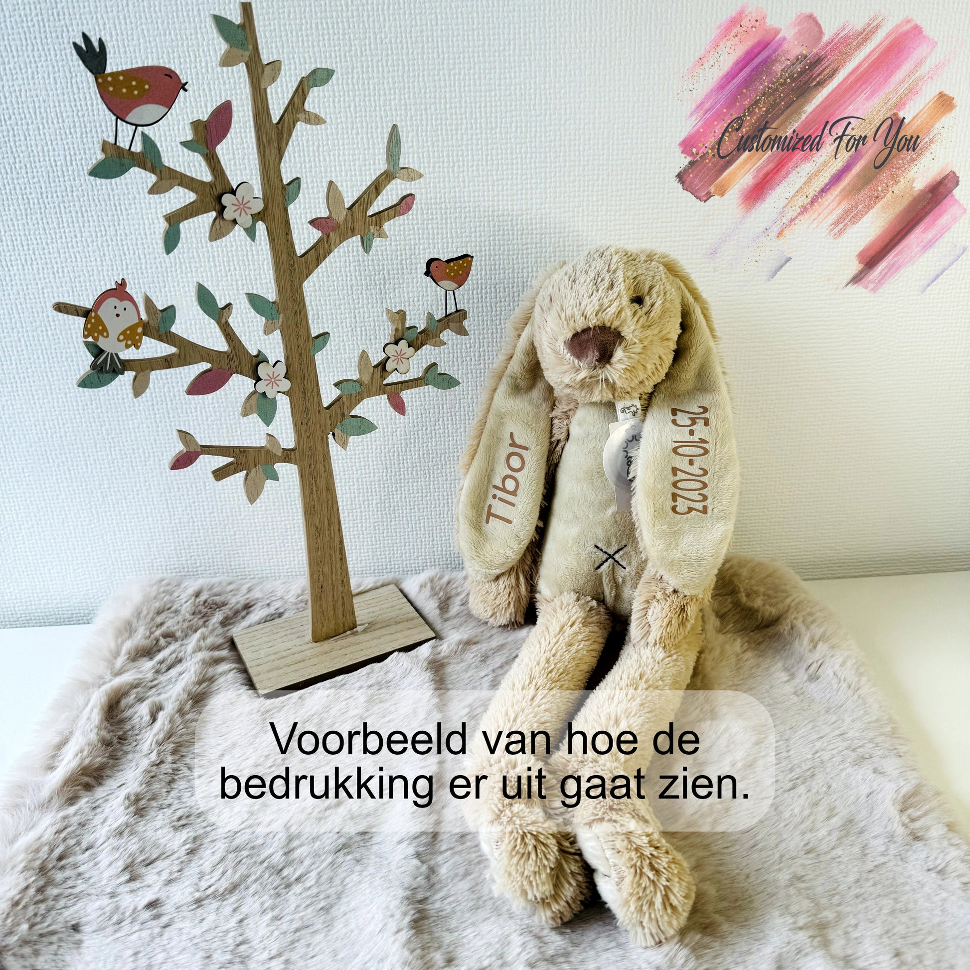 Laat de naam en geboortedatum bedrukken op de oren van het konijn.
