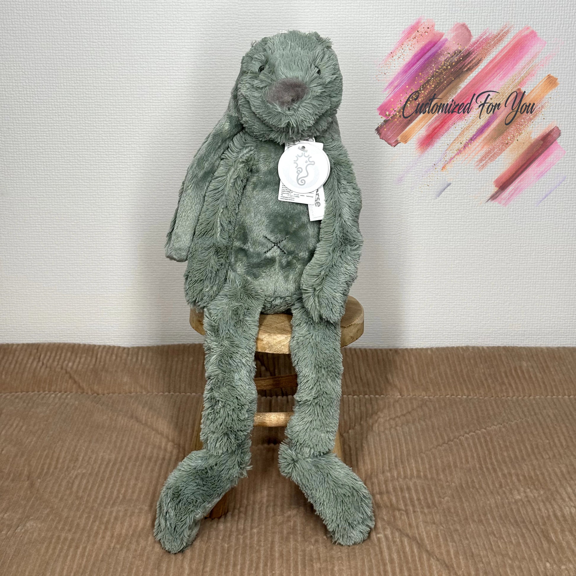 Laat de naam en geboortedatum bedrukken op de oren van het konijn.